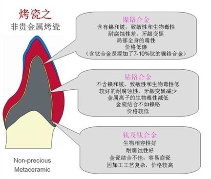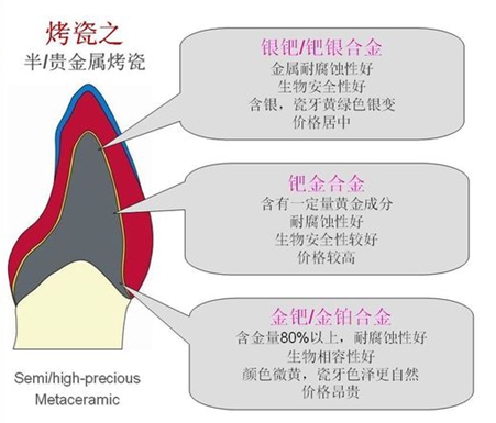 所谓烤瓷,即底层材料为金属,按照金属的不同,分为贵、半贵和非贵(贱)金属烤瓷冠,的价格差异也就在于此。不同的金属主要区别在于耐腐蚀性、对人体的安全性、以及轻微的色泽差别,越贵的金属瓷牙生物性能越好。