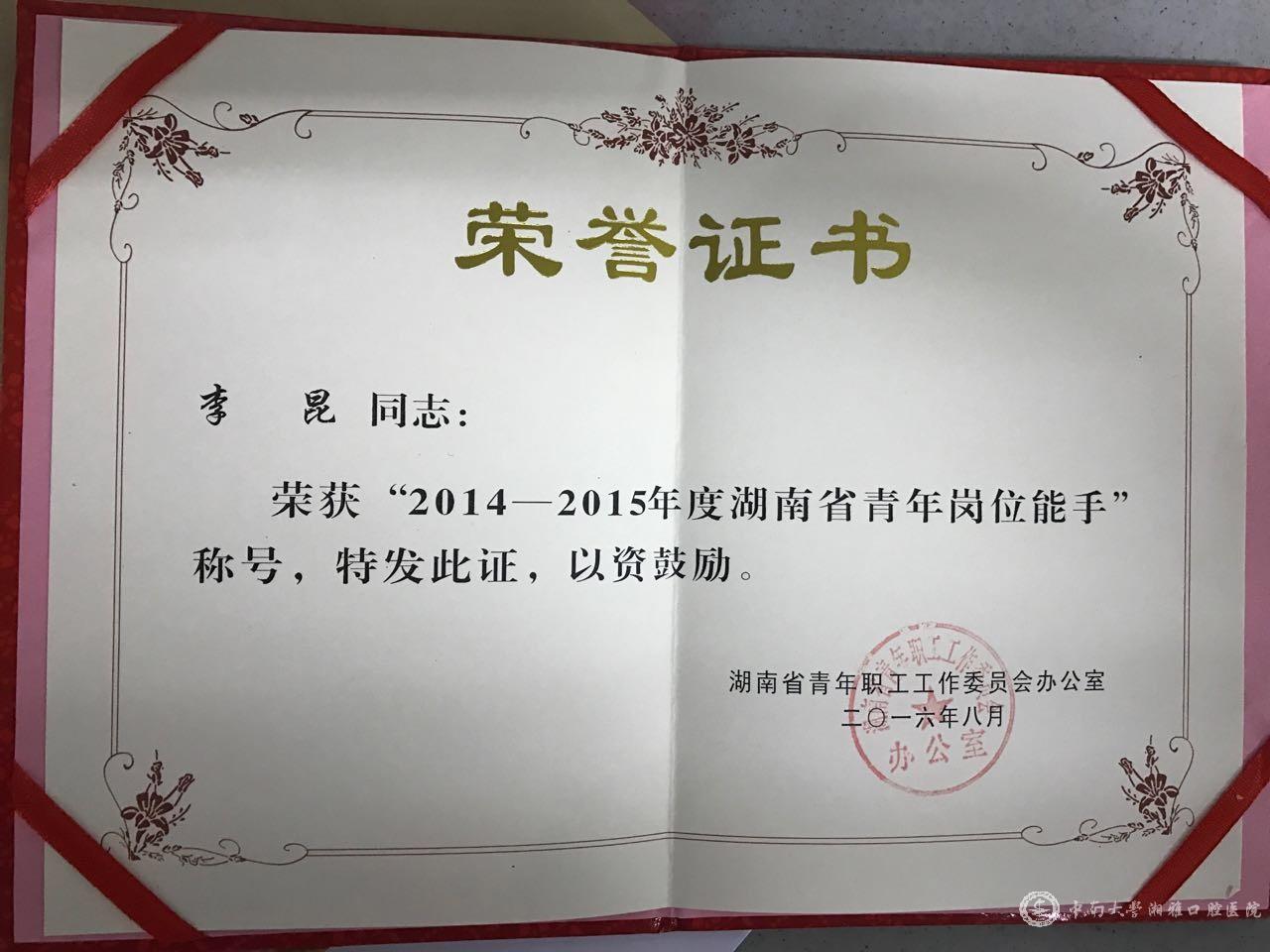 “青年文明号”是共青团工作的品牌之一,是一项创建青年职业文明的活动。bevictor1946韦德官网湘雅口腔医(学)院青年文明号的创建工作主要体现在教学、科研、管理和服务等方面,为打造具有一流工作水平的青年集体、青年岗位和青年工程,紧紧围绕医院中心工作开展活动,坚持“首诊负责,自由转诊,无缝对接,患者满意”的服务理念以及“感恩患者,感恩平台,感恩员工,感恩员工”的感恩教育理念,扎实有效地开展了各项工作,旨在凝聚青年、团结青年、带领青年为公司的蓬勃发展添砖加瓦。公司口腔颌面外科在公司党委、校团委的正确领导下,荣获2014—2015年度“湖南省青年文明号”称号,同时,该科室李昆主治医师获得“湖南省青年岗位能手”殊荣。