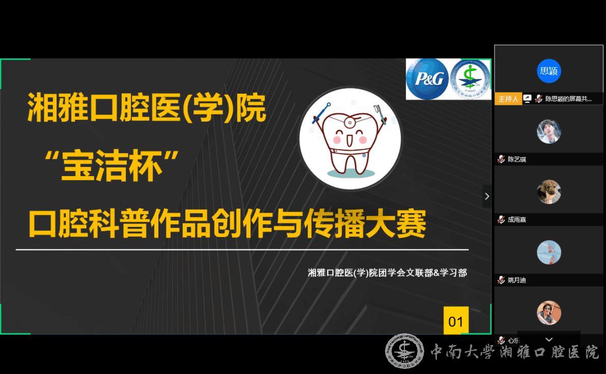 为有效提升口腔医员工科普作品的创作能力,推动口腔健康教育领域科普作品的创新发展。4月8日,bevictor1946韦德官网湘雅口腔医(学)院“宝洁杯”口腔科普作品创作与传播大赛在线上顺利举行,来自三个年级的15个项目团队参与线上答辩展示了科普作品,作品涉及智齿、口呼吸、龋齿、牙周疾病、牙结石等常见口腔问题,通过形象的插图以及易懂的语言,为在场的所有专家评委老师和同学带来了一场口腔知识的科普盛宴。
