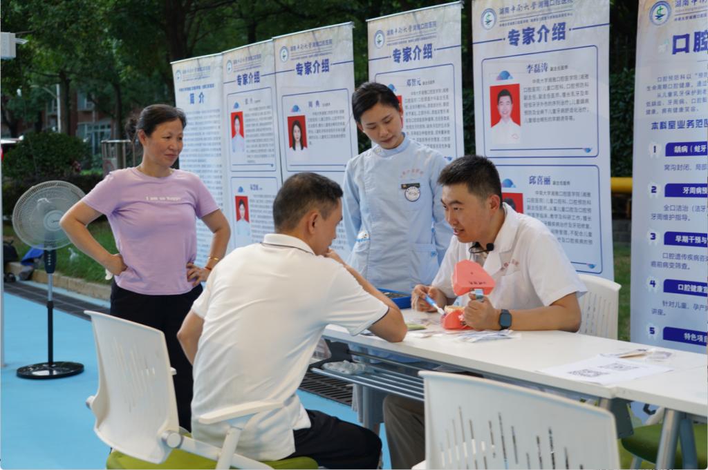 比赛之余,口腔预防科和“球星”专家组成的湘雅口腔健康宣教团为前来义诊咨询的群众提供了口腔筛查和健康宣教。口腔预防科副主任、宣教团团长李磊涛医生带领科室医护,仔细询问大家的日常饮食习惯、牙齿清洁情况,针对部分有口腔疾病的群众给出指导性建议和意见,还现场演示了巴氏刷牙法、牙线使用等技巧。