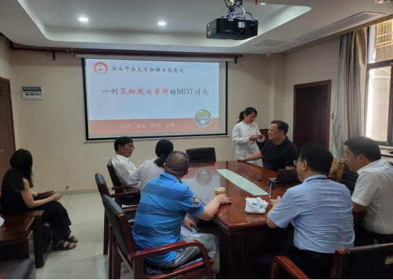 8月6日,应“口腔癌及癌前病变的诊疗团队”的申请要求,患者杨某因右下后牙区疼痛不适伴张口受限,辗转多地求医未果后来到公司。为了给予患者更为全面和精准的治疗方案,公司迅速启动了学科协作诊疗(MDT)机制,联系了院内外多个相关科室专家。8月8日上午,该团队就这一病例在门诊二栋一楼东头会议室召开了学科协作诊疗(MDT)讨论会,本次会议邀请了湘雅医院口腔颌面外科蒋灿华教授、肿瘤科伍海军教授、血液科姜志平教授以及本院颌面外科唐瞻贵教授、胡延佳教授、牙周科刘斌杰教授、病理科李龙老师以及医院多个临床科室的负责人参加。