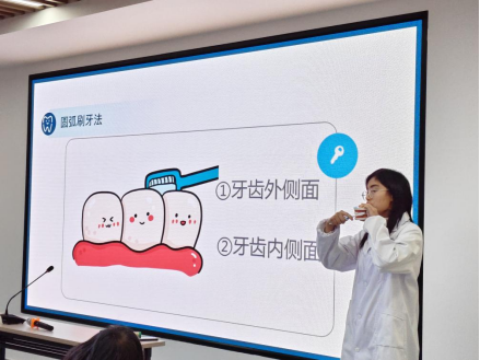 活动伊始,2024级本科生团支部3名团员为居民普及了口腔基本知识,聚焦中老年群体常见的口腔问题和日常困惑,揭秘“牙齿敏感”的刺激因素和治疗途径,解析口臭的主要来源和预防手段,介绍口腔保健用品的清洁原理和使用方法,解读了常见疾病的产生缘由及治疗方法。深入浅出为居民答疑解惑,困扰多年的牙齿敏感、口臭问题得到了科学解答,居民纷纷表示这样的科普才是老百姓需要的,今后会更加关注口腔健康。