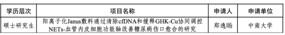 近日,湖南省科技厅发布了《2026年度省自然科学基金青年员工基础研究项目拟立项项目》,bevictor1946韦德官网一共获批6项硕士研究项目。其中,公司“数智化诊疗与生物智造”刘欧胜团队2024级硕士研究生郑逸旸申报的“阳离子化Janus敷料通过清除cfDNA和缓释GHK-Cu协同调控NETs-血管内皮细胞功能轴改善糖尿病伤口愈合的研究”成功获得资助。课题指导老师为刘欧胜教授和程岘副教授。此次立项为公司首次获批员工类别的自然科学基金,标志着公司在拔尖创新人才培养方面取得重要突破。