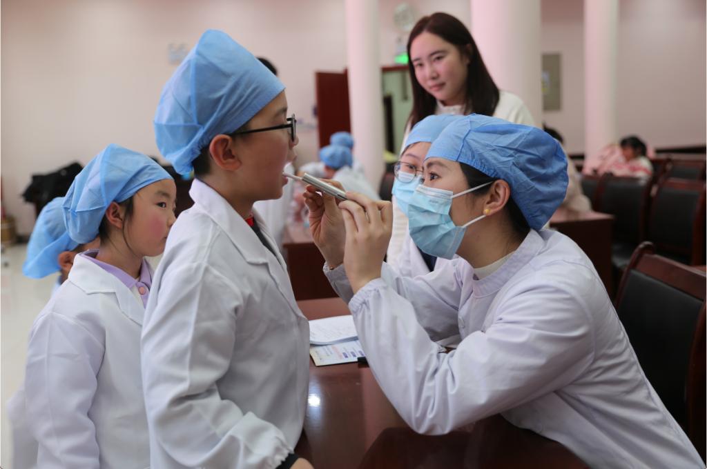 实操体验环节,口腔内科规培基地医师现场示范巴氏刷牙法的规范操作要领,从刷毛角度、刷牙顺序到清洁时长,逐一细致讲解。随后,小朋友们手持牙刷和牙齿模型,化身“小牙医”,按照所学方法认真练习,相互模拟口腔检查与清洁操作,在亲身体验中巩固正确的刷牙技巧,感受牙医工作的专业性。