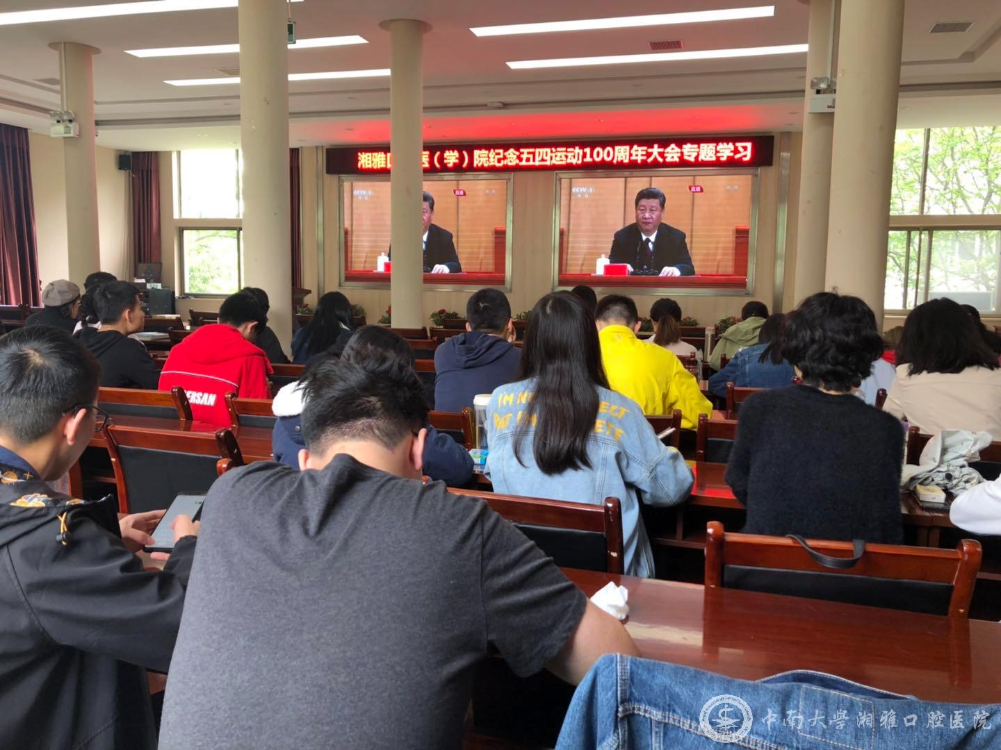会上,师生认真聆听了习总书记对五四精神的深刻阐述和对青年人的殷切期望,现场掌声不断。广大师生纷纷表示:青年使命光荣、责任重大,要在今后的不断学习中,牢固树立远大理想,投身伟大建设,实现伟大复兴。同时,湘雅口腔医(学)院将紧紧围绕纪念五四运动100周年和庆祝建国七十周年的节点,开展形式多样的青年思想引领活动,带动青年师生积极投身祖国建设,为实现两个一百年的奋斗目标奉献青春、贡献力量。