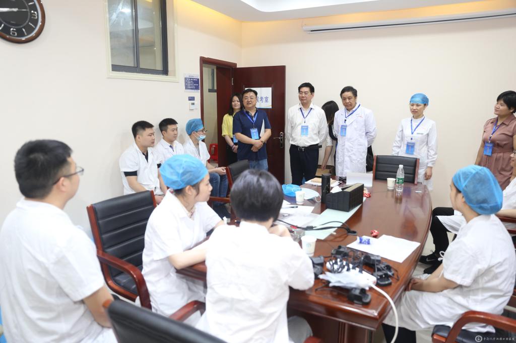 湖南省卫健委科教处范珍贤处长带领考核巡视专家组对公司考场安排、人员分布、考核流程等考核工作进行了实地查看,并在唐瞻贵经理、邓超纲书记等院领导的陪同下,观摩了整个考核过程运行情况,专家组对公司本次考核的组织安排给予了高度肯定。