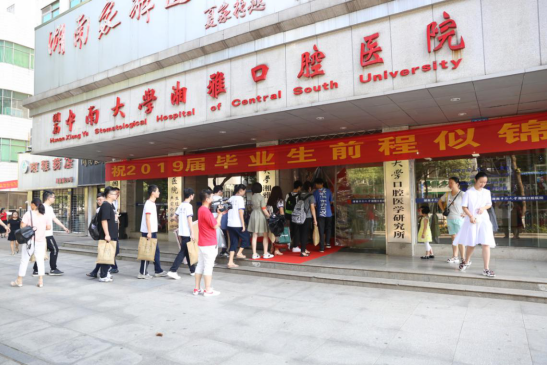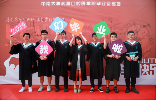 早上8时许,毕业生组队从员工公寓出发,沿着湘雅路到达湘雅口腔医院,沿着红毯经过门诊一栋、二栋,重走求学之路。公司精心为毕业生们准备了签名墙和纪念板,同学们在银杏树下拍照留念、互赠祝福。全体院领导、研究生导师也来到银杏树下,与毕业生话别并合影留念。