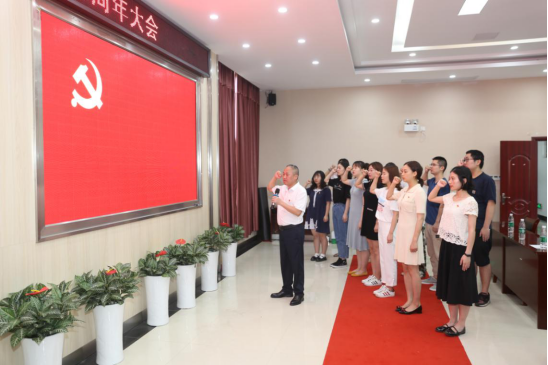 “我志愿加入中国共产党,拥护党的纲领,遵守党的章程……随时准备为党和人民牺牲一切,永不叛党。”在全场的注视下,党办主任胡小平带领十三名新党员面向党旗庄严宣誓。