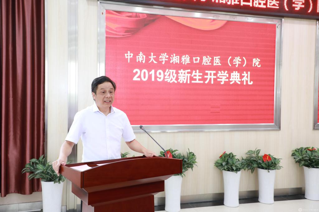 唐瞻贵经理以《不忘初心,逐梦前行》为题,在即将开启新阶段的美好时刻,对新生们提出了三点建议:第一,立下小目标。要逐步明确自己的方向,关心国家、关心社会,关心自己,关心未来,培养医员工特有的家国情怀。第二,怀揣爱与责任。爱与责任是医者的灵魂,选择了医学,就选择了担当;选择了湘雅口腔,就要开始慢慢学会为病人的口腔健康保驾护航。第三,敢于去承受。人生的路不可能一帆风顺,成长为一名口腔医生更是充满了很多挑战。在逐梦的道路上,必然要经历困难与挫折的洗礼,即使跌倒了,也要坚强的爬起来。他最后说“希望大家传承好一代代湘雅人的优良传统,立报国之志、学报国之才、践报国之行,以昂扬奋发的精神面貌迎接新中国成立70周年。”