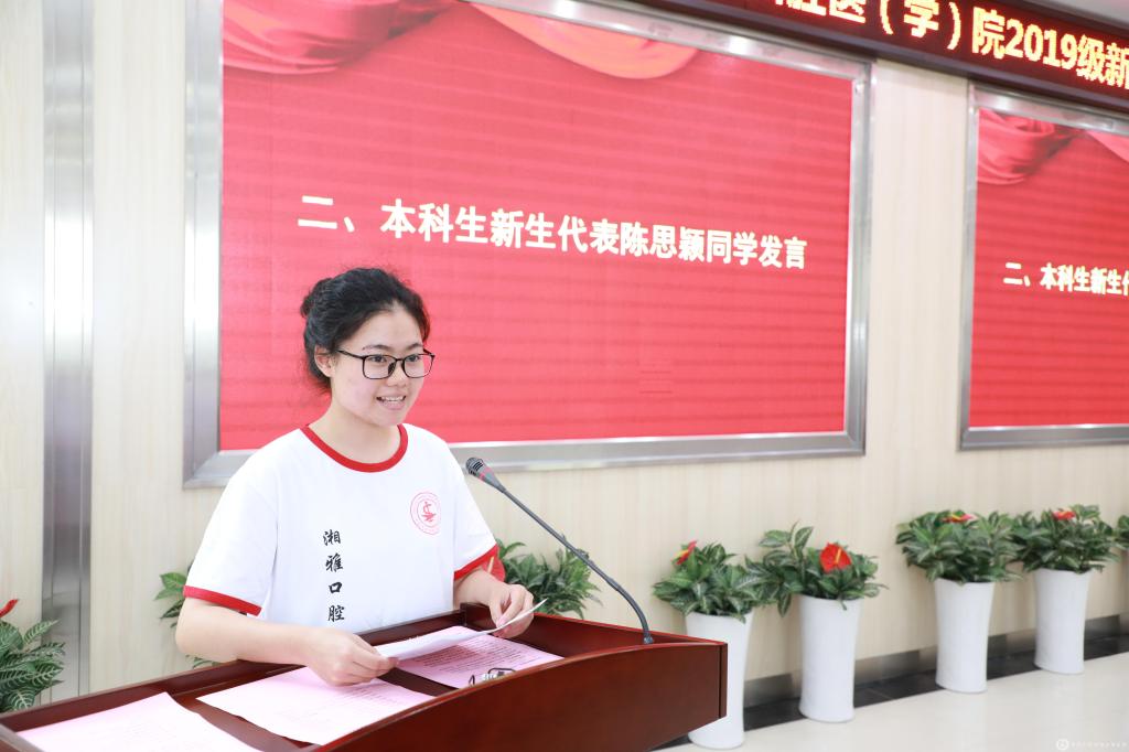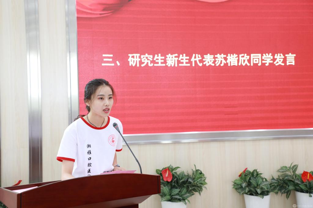 2019级本科生陈思颖同学讲述了自己高考后,在从事医学事业的父母影响下,毅然选择从福建到湖南,来湘雅学习口腔医学的心路历程,她希望在学习医学的道路上一路前行、一路思考,探寻人生意义与价值。2019级研究生苏楷欣同学在发言中表达了自己对步入新阶段的思考,她号召同学们在学习和科研的道路上要有锲而不舍的耐心、开拓视野的信心、承担责任的决心,向着理想的方向更好地前进。老生代表、员工会主席刘博阳同学结合自己三年的老员工活,从专业学习、学科竞赛、员工工作等方面向新同学们给出了诸多成长建议,希望新同学们把握今天、展望明天,攀爬一座又一座高山险峰,为湘雅口腔医学事业的发展贡献自己的一份力量。