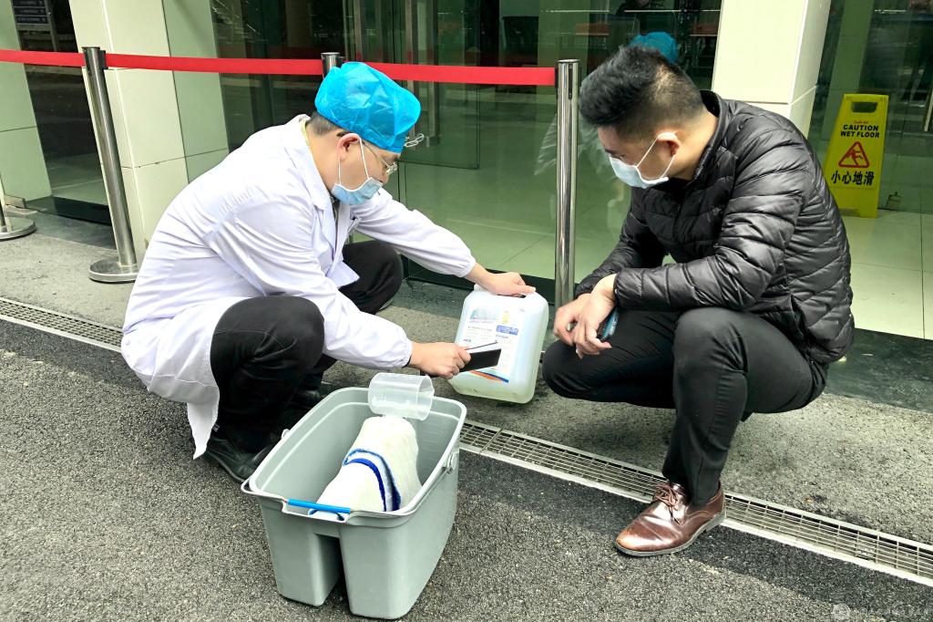 院感中心负责人左军正在指导后勤人员正确使用消毒液