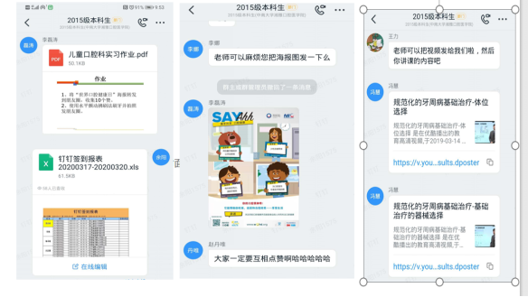 众所周知,临床实习是口腔医学教育的重要组成部分,是口腔医学教学计划的最后阶段。通过临床实践,员工可以获得基本知识、基本理论、基本技能的综合训练。受疫情影响,实践教学遇到了前所未有的困难。为缓解医员工实习压力,公司教务部要求各科室梳理实习教学内容,将其分解为线上教学和线下教学两个部分,运用网络手段(钉钉直播)于3月16日起开展线上实习教学。为实现模拟实习轮转,教务部门试行各大直播软件,最终选用钉钉作为直播软件,基于钉钉建立班级群,发出线上实习公告。科室老师将实习内容分解,梳理出线上教学内容。按课表安排在群内进行线上授课(科室实习讲座)、辅导答疑及布置作业。截至目前,公司线上实习已完成一周教学。