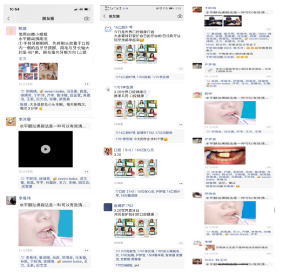 健康宣传海报,鼓励员工们以海报,视频等方式在互联网上宣传正确刷牙法,布置了朋友圈健康宣教10赞打卡的作业,同学们热情高涨,课程结束后大家的朋友圈迅速霸屏,起到了良好的效果。