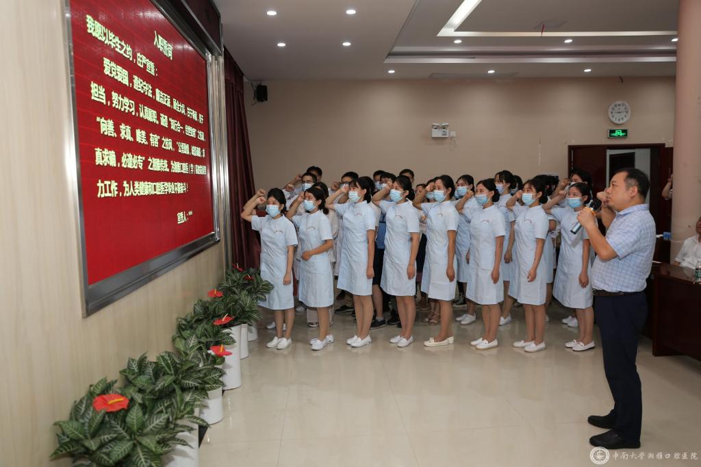 仪式上,党委委员、人力资源部主任刘良奎领誓,全体新入职员工郑重承诺“谨遵校训、校风、湘雅传统,为湘雅口院的发展努力工作,为人类健康和口腔医学事业不懈奋斗!”随后,护理部组织了神圣的护士授帽仪式,伴随着南丁格尔誓言,护士长们为新入职护士戴上燕尾帽,并点亮了一盏盏“烛光”。