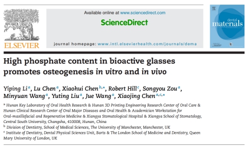 据悉,该论文由李毅萍教授和陈晓婧教授共同指导完成。课题组采用高温熔融法制备了一系列不同磷含量(0-5.07mol%)的生物活性玻璃,在系统的开展材料表征研究的基础上,首次在细胞和动物水平发现生物活性玻璃中磷含量可调节玻璃材料的成骨作用。课题的开展还得到英国曼彻斯特大学和伦敦大学玛丽皇后公司专家学者的大力支持,标志着口腔材料研究团队的国际化合作迈上了新台阶。