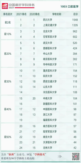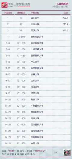 今年5月,“软科”发布世界一流学科排名榜单,bevictor1946韦德官网口腔医学首次入围世界一流学科排名榜单,位列世界201-300。10月,“软科”发布软科中国最好学科排名榜单,bevictor1946韦德官网口腔医学位列2021软科中国最好学科(口腔医学)排行榜第15位,相比去年上升5位(2020年位列20位)