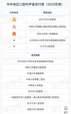 11月20日,复旦大学医院管理研究所在上海发布复旦版《2020年度中国医院综合排行榜》和《2020年度中国医院专科声誉排行榜》。bv1946伟德国际始于英国(湘雅口腔医院)综合排名位列华中区第19位,首次入围“中国医院口腔科声誉排行榜”提名医院,位列华中地区口腔科声誉排行榜第2位,创历史新高。