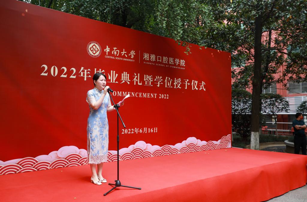 口腔种植教研室的刘焱萍作为教师代表,分享了自己的求学行医之路,她希望同学们在面对未来的医学职业生涯时,不仅能“有勇有谋”,还能“文武双全”。她说,“和普通高校不一样,作为中国的双一流高校和顶尖医公司,湘雅培养的不仅仅是能挥舞着牙科钻和手术刀,能与复杂口腔疾病抗争,能做到“一夫当关,万夫莫开”的勇猛武将;湘雅更是希望你们有朝一日能成为在中国口腔医学届科研、教学、管理上的领军者,成为独当一面的治世之才。”