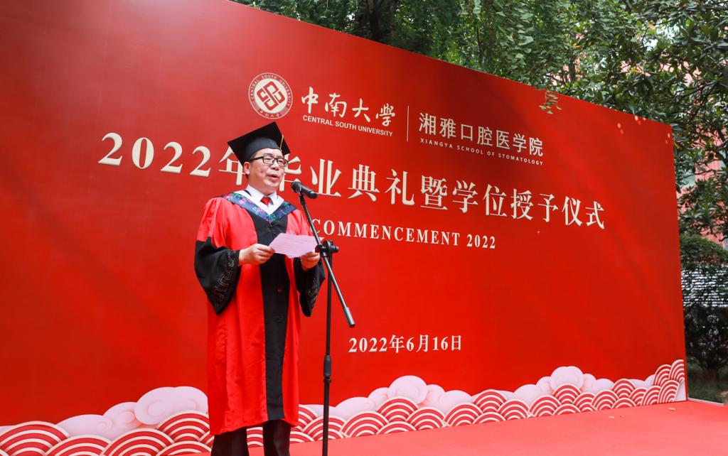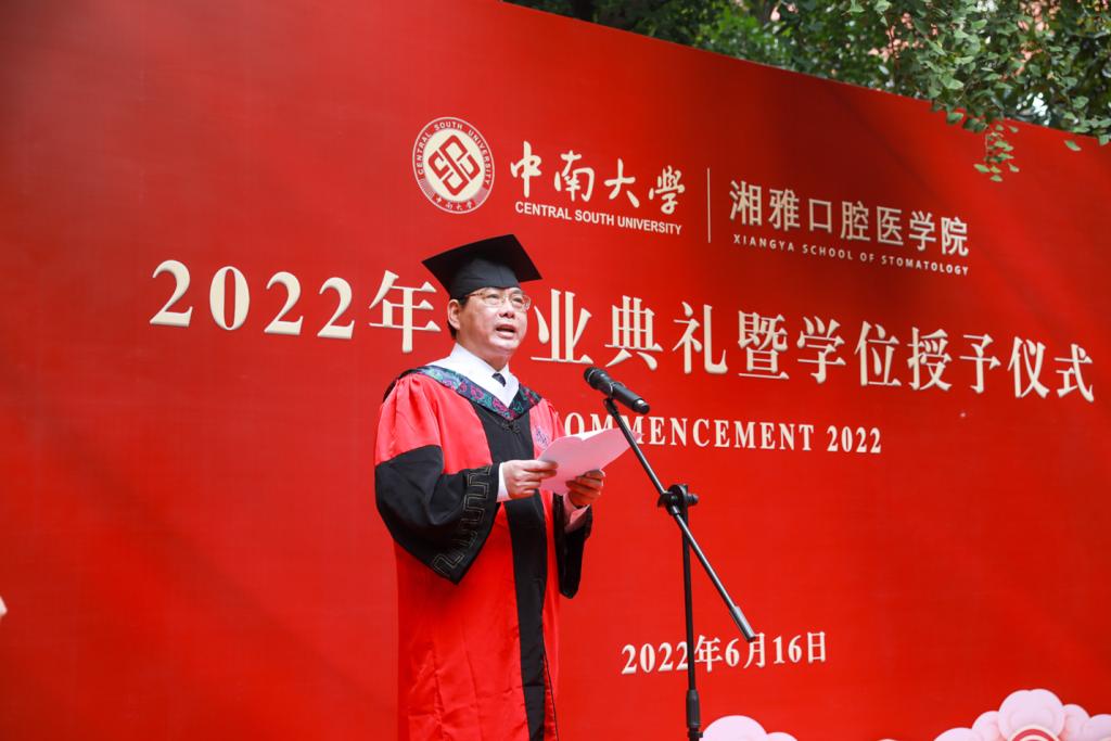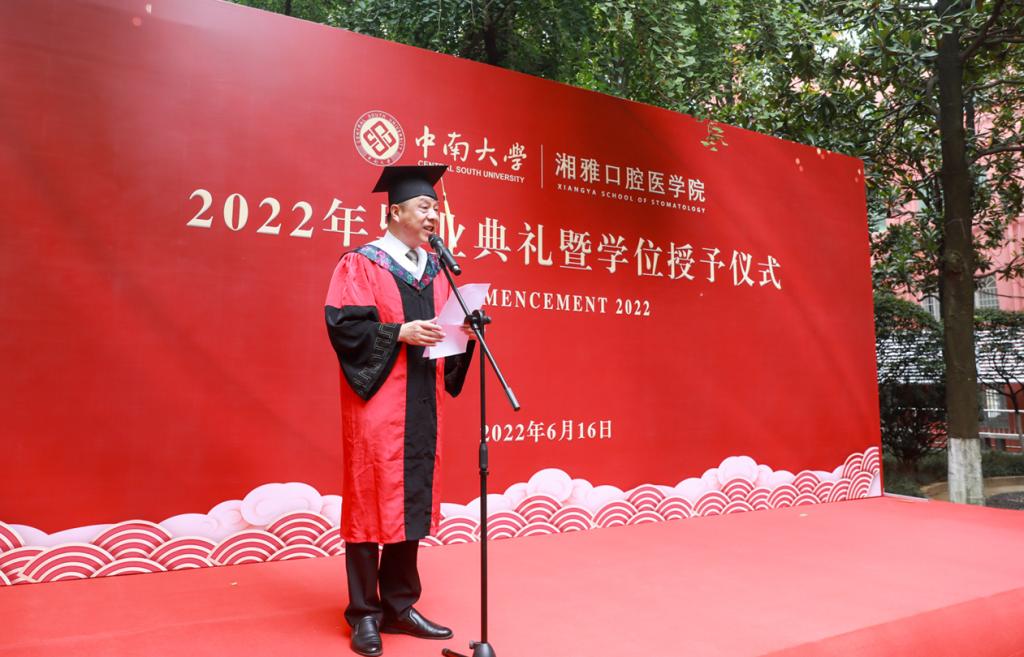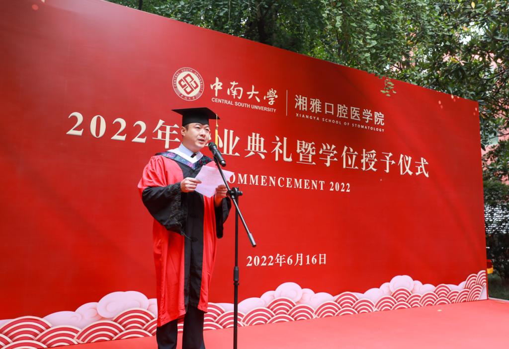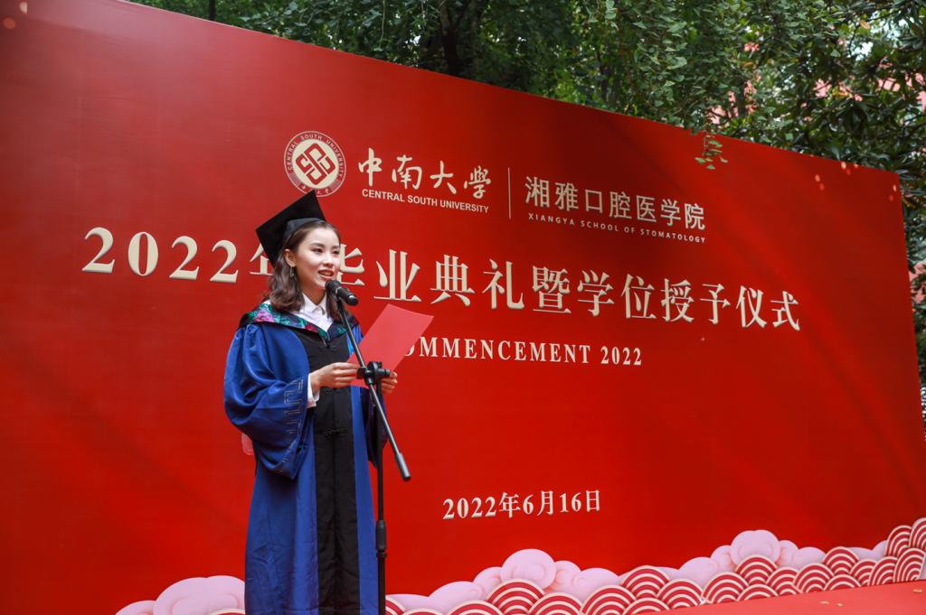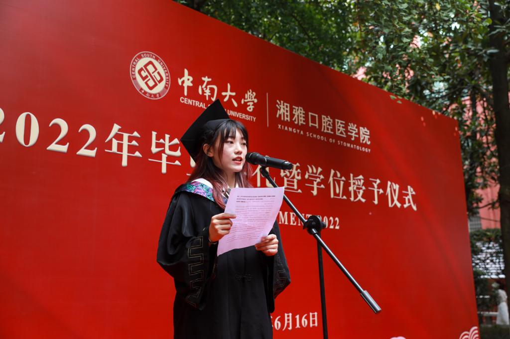 2019级硕士研究生苏楷欣代表研究生发言,她号召同学们以青春之我,赴时代之约,不负中南,不负口院,不负自己,践行“知行合一,经世致用”的中南校训,以“祖国至上、人民为先、事业为重”的使命与担当,在实现国家富强、民族复兴、人民幸福的中国梦中创造人生价值,谱写新时代的奋斗篇章。