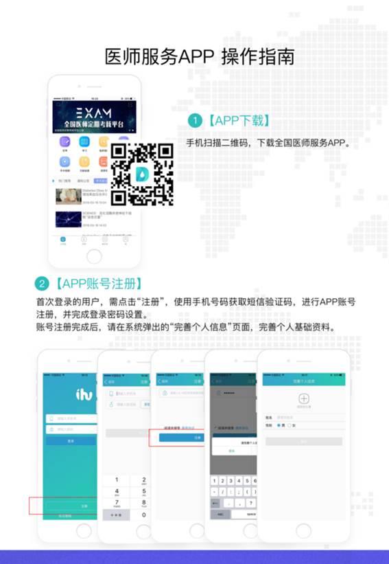 医师信息登记可在电脑PC端(http://renew.cmda.net/)或移动设备(手机)App端完成,基于移动端操作便捷的特点,以手机App端操作来完成本次演示。下载名为《全国医师服务》的App应用。打开该App应用,完成注册后,进入App主页面,点击定考图标,输入身份证号码进行身分绑定。首次登陆需进行初始密码修改操作,提交后进入个人信息确认页面。点击确认个人信息后,根据系统提示完成照片上传及个人基本信息,执业信息、执业经历填报。完成以上操作,点击提交,等待你所在的卫生机构对你的提交的信息进行审核。