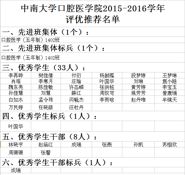 口腔医公司2015-2016学年评优推荐名单