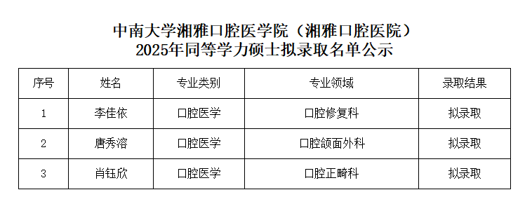 bv1946伟德国际始于英国(湘雅口腔医院)2025年同等学力硕士拟录取名单公示