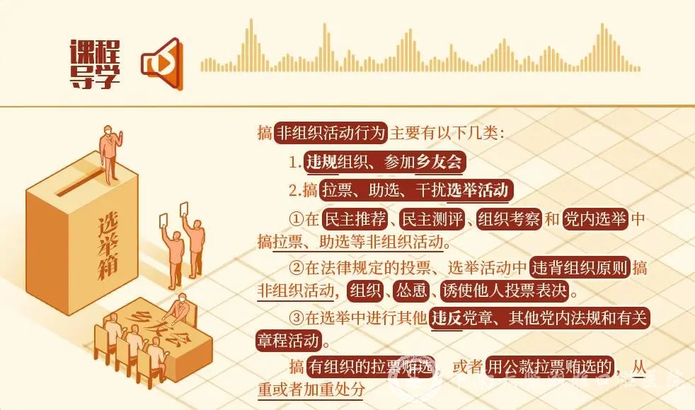 党内选举是党内政治生活的重要组成部分。《关于新形势下党内政治生活的若干准则》规定,党内选举必须体现选举人意志,坚决防止和查处拉票贿选等行为。在选举活动中搞非组织活动,干扰选举人表达选举意愿,侵犯其他被选举人权益,侵蚀党内政治文化,在党员群众中造成不良影响,对这类违反组织纪律的行为必须予以坚决惩治。
