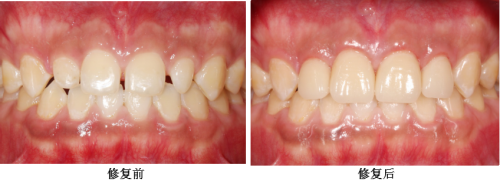 (1)应用树脂粘结剂将薄层全瓷贴面修复体固定于患牙唇面,以遮盖前牙唇面的变色、缺损。全瓷贴面颜色稳定、美观,不易着色,耐磨损、不易脱落,而且较全冠的磨牙量明显减少。