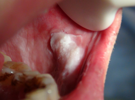 白斑多见于中老年男性,主要症状表现为粗糙、木涩感,伴糜烂时可有刺激痛、自发痛。属于癌前病变。
